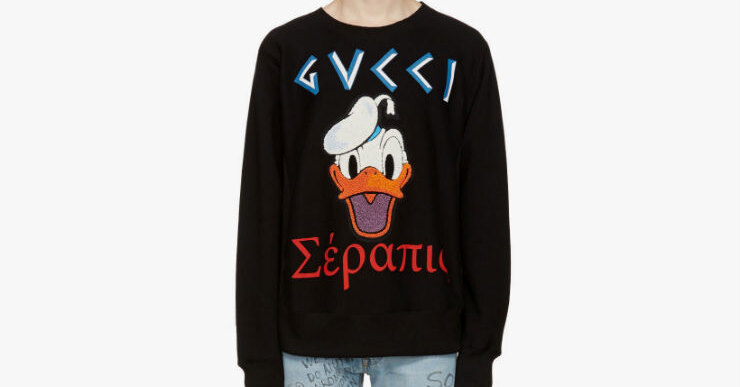 Последним героем итальянского бренда стал небезызвестный мультипликационный персонаж — Дональд Дак. Ассортимент Gucci пополнился новыми изделиями: диснеевская утка украсила собой джемпера и шелковый бомбер.