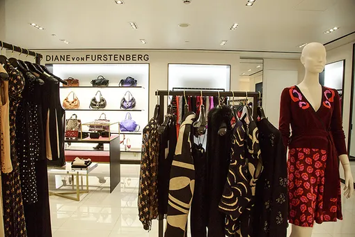 Интерьер нового корнера Diane von Furstenberg выполнен в знаковой для бренда черно-белой гамме, лишь изредка «разбавленной» яркими деталями цвета фуксии. Пространство площадью почти сто квадратных метров поделено на несколько зон: здесь уже представлены наряды и аксессуары из осенне-зимней коллекции дизайнера. Так что за свободными жаккардовыми пальто, удлиненными свитерами, и, конечно же, платьями с запахом Diane von Furstenberg отныне можно смело отправляться на третий этаж ЦУМа – самое время устроить модную «разведку»!
