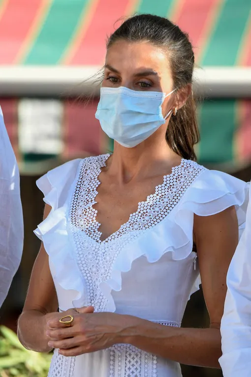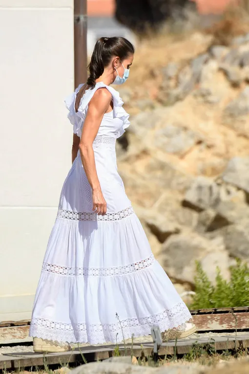 Королева Испании Летиция продемонстрировала аутфит в стиле бохо. Белое полупрозрачное платье в пол с рюшами, кружевными вставками и V-образным вырезом в зоне декольте позволило королеве создать легкий образ — идеальный для летнего отпуска. Лук дополнили белые эспадрильи на каблуке и соломенная вязаная сумка.