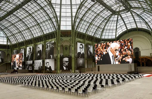 Этим вечером парижский Гран-Пале принимал почетных гостей: близкие друзья и почитатели таланта собрались на вечере памяти Карла Лагерфельда. Хотя дизайнер ушел из жизни в феврале этого года, он словно присутствовал на сегодняшней теплой встрече и наблюдал за происходящим — пусть и с гигантских фотографий на стенах Большого дворца.