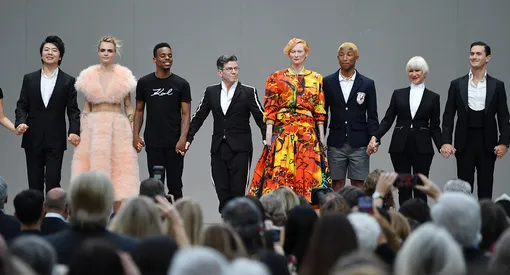 Пока Клаудия Шиффер, Карла Бруни, первая леди Франции Брижит Макрон, Джиджи Хадид, Стелла МакКартни и другие гости расположились в зале, на сцену вышли участники перформанса в чеcть Кайзера Карла.