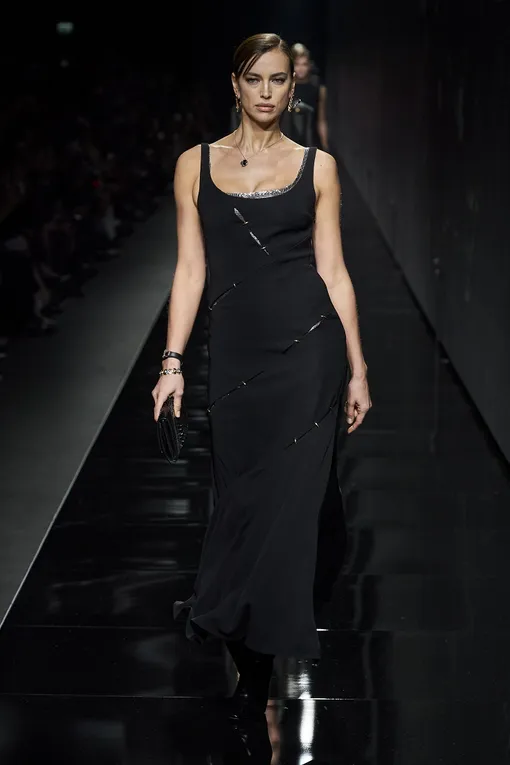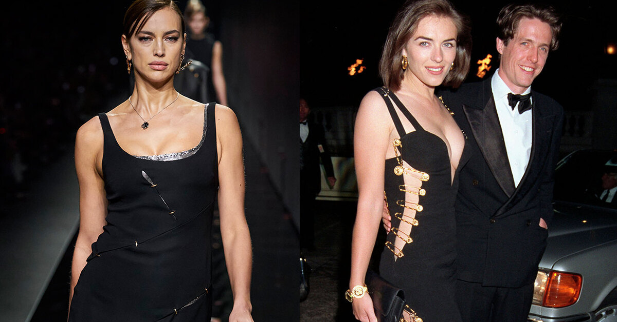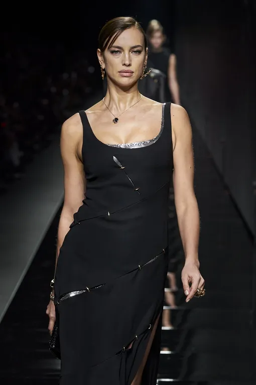 Ирина Шейк вышла на подиум Versace в платье с разрезами на булавках, как у Лиз Херли в 1994-м