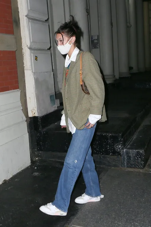 В качестве брюк модель выбрала широкие мешковатые синие джинсы, а на ноги Белла Хадид надела кроссовки Nike x Off-White Air Force 1, которые создал ее друг Вирджил Абло еще в 2017 году. Дополнили и без того стильный образ иконы стиля сумка-багет от Louis Vuitton с монограммой бренда и аксессуары: несколько цепочек и подвесок на шее, а также сережки в богемском стиле.