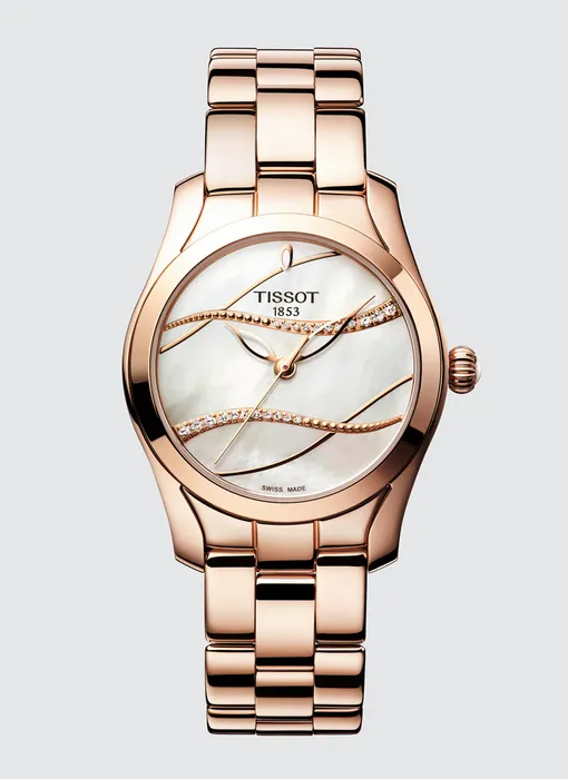 В бутике часового бренда Tissot на Тверской уже ждет новинка Базеля — коллекция часов Tissot T-Wave с россыпью бриллиантов на циферблате, стрелками в виде лепестков и жемчужиной на отметке 12. В «обязательной программе» — кварцевый механизм с индикатором заряда батареи, корпус из нержавеющей стали, сапфировое стекло и PVD-покрытие из розового золота.