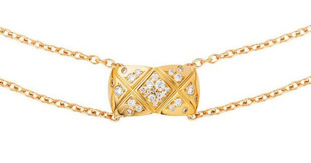 На коллекцию Coco Crush ювелиров Chanel вдохновил один из символов модного Дома — стеганый узор, как на легендарной сумке 2.55. Теперь к кольцам, серьгам и браслетам присоединились короткие колье из желтого, белого и beige-золота. Изделия украшены подвесками с фирменным орнаментом matelassé и бриллиантами.