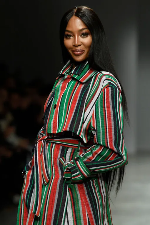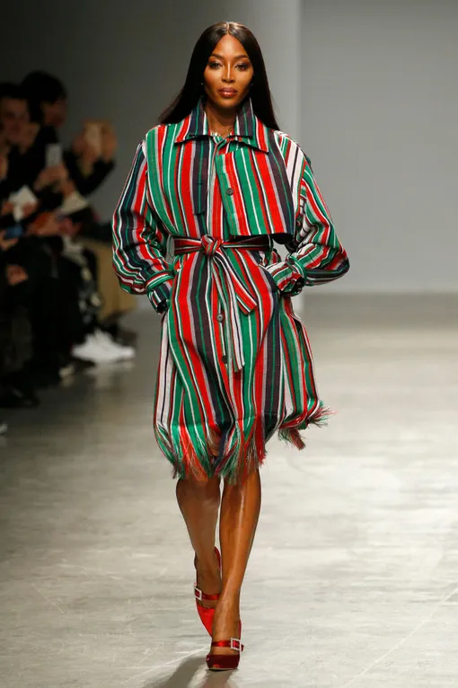 Наоми вышла на подиум в полосатом платье-рубашке с поясом на талии и бахромой на юбке. Наряд в оттенках белого, зеленого, черного и красного идеально сочетался с цветом кожи модели. Завершением образа звезды стали вишневые лодочки с эффектной пряжкой.