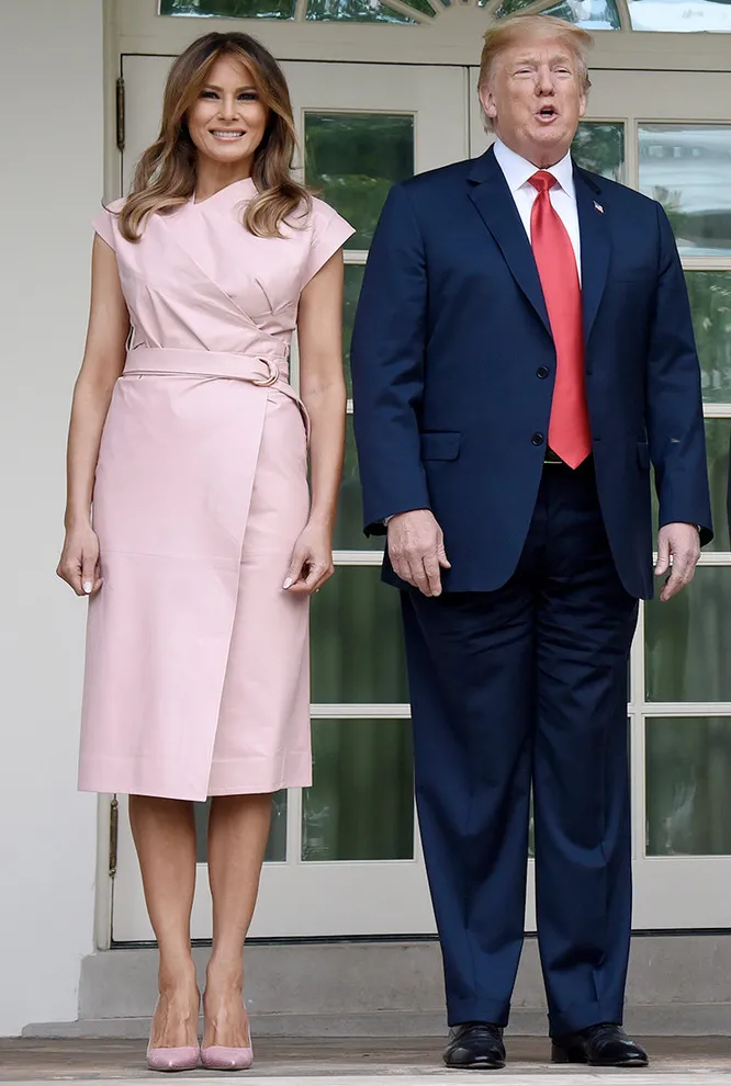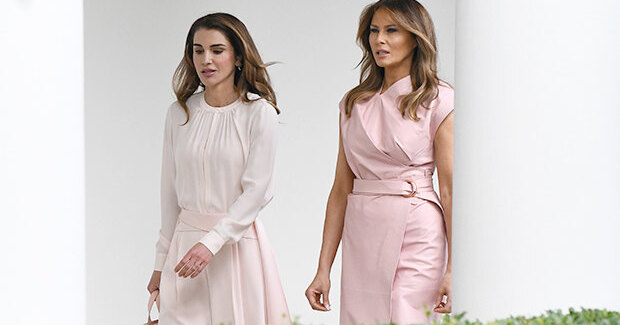 Вчера король Иордании Абдалла II ибн Хусейн и его супруга королева Рания аль-Абдулла приехали в Вашингтон с официальным визитом. Президент США Дональд Трамп встретил гостей вместе со своей супругой в Белом доме. Для официального мероприятия Мелания выбрала нежно-розовое платье-футляр и классические лодочки в цвет. Рания на удивление также появилась в комплекте схожего оттенка. Королева предпочла комбинезон нежного цвета.