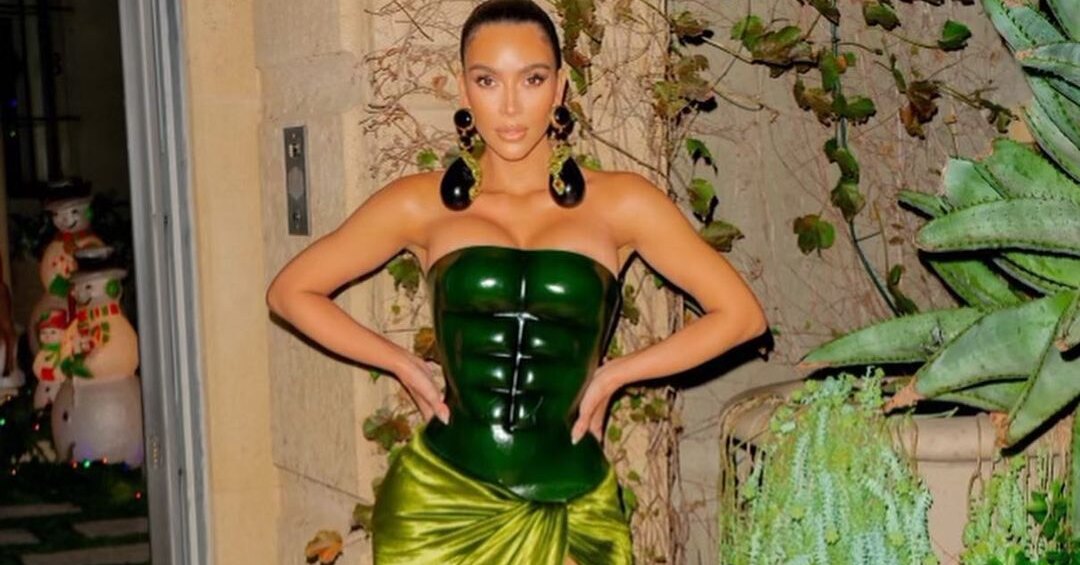 Ким Кардашьян всегда умела выбирать впечатляющие наряды. На этот раз у себя в Инстаграма (Социальная сеть признана экстремистской и запрещена на территории Российской Федерации) звезда поделилась аутфитом, который она надела на празднование Рождества. Она выбрала необычный лук от итальянского бренда Schiaparelli — платье, состоящее из темно-зеленого корсета без лямок, которое имитирует кубики пресса, и салатовой шелковой юбки.