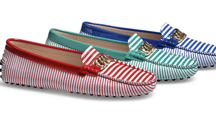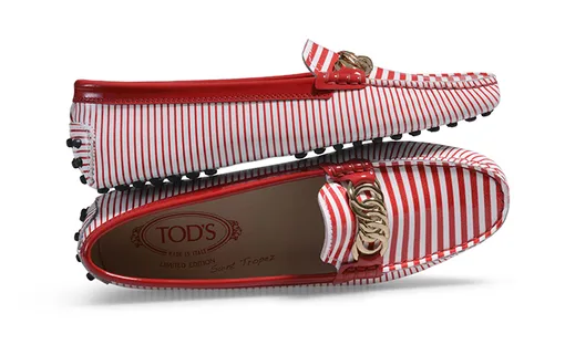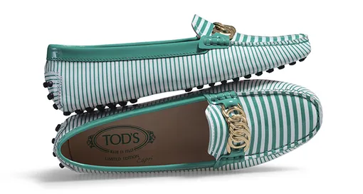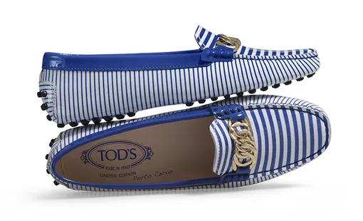 Визитная карточка Tod's – мокасины Gommino – в этом сезоне предстали в новом облике. В лимитированную коллекцию вошли пары, украшенные «морской» полоской одного трех цветов. Каждая из моделей посвящена известному средиземноморскому курорту (синяя – Порто-Черво, бирюзовая – Капри, красная – Сен-Тропе) и декорирована металлическими кольцами, напоминающими корабельную цепь. Новинки поступят в продажу в июле – в самый разгар отпускного сезона!
