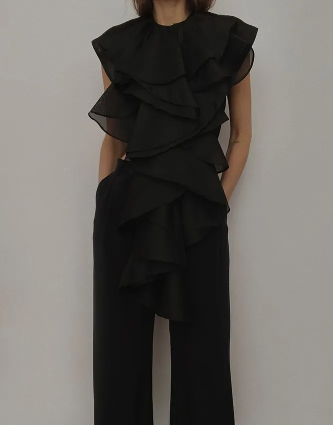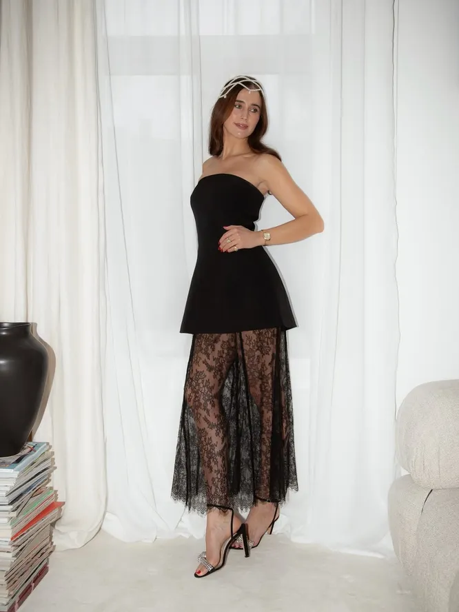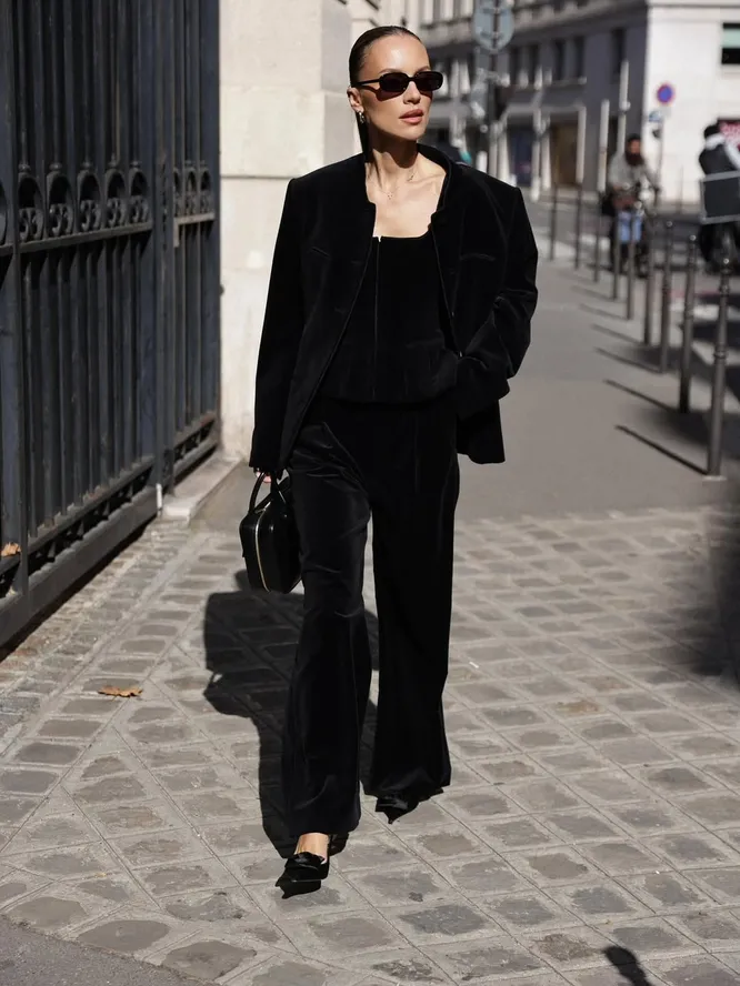Выбор ткани одежды играет ключевую роль в создании эффектного тотал-блэк образа на Новый год. Забудьте о скучных хлопковых футболках и простых джинсах. Новогодний вечер требует роскоши. Бархат, атлас, кружево, шифон, жаккард, шелк – вот ваши лучшие союзники. Бархатное платье-миди с глубоким вырезом станет идеальным вариантом для создания элегантного и соблазнительного образа. Атласная юбка в сочетании с черной шелковой блузой добавит аутфиту нотку гламура. А кружевное платье или лонгслив придаст образу романтичности и изящности. Кстати, можете и вовсе одеться в ажурную одежду с ног до головы. К примеру, это могут быть брюки в сочетании с топом или боди с юбкой в пол. Но в таком случае советуем дополнить лук лаконичным бельем и строгим объемным пиджаком — они снизят градус сексуальности. А если хотите блистать в новогоднюю ночь, присмотритесь к черным вещам с пайетками или добавлением люрекса. Такой дизайн придаст луку нарядности.