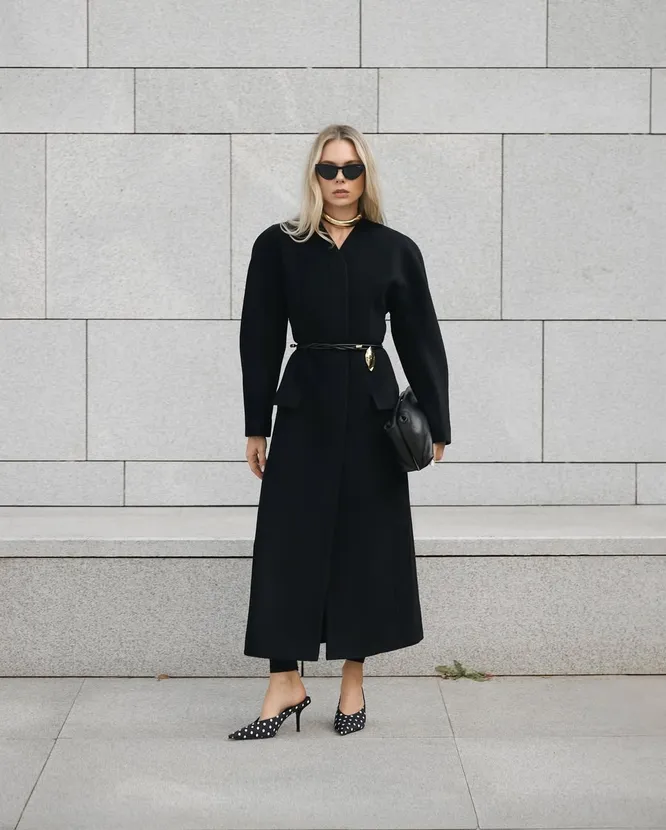 Для завершения образа в стиле тотал-блэк на Новый год, необходимо тщательно подобрать аксессуары. Если вы выбрали простое платье, добавьте к нему массивные серьги и подвеску. В случае, если наряд уже сам по себе богат деталями, остановите свой выбор на более лаконичных аксессуарах. Это может быть изящное кольцо, минималистичный клатч или тонкий браслет. Не забывайте и о важности обуви. Высокие лодочки на шпильке визуально вытянут силуэт и добавят луку женственности, а удобные туфли на kitten-heel позволят вам чувствовать себя комфортно всю ночь. А особенно интересно будет выглядеть черная обувь с акцентным скульптурным каблуком — с ней вау-эффект гарантирован. Больше идей для образов в стиле тотал-блэк ищите в галерее ниже.