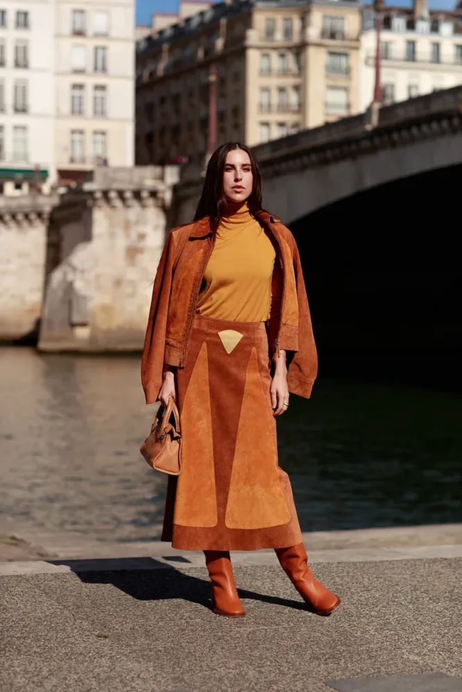 Помимо натуральных природных оттенков — таких как охра, хаки и шоколадно-коричневый, — предлагаем обратить внимание на изделия из цветной замши, например, насыщенно синего или розового оттенка. Героини стритстайла и модные инфлюенсеры предлагают использовать замшу в том числе и для монохромных тотал луков.