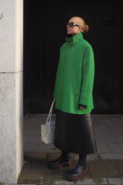 Пожалуй, самый элегантный вариант. Он идеален для деловых встреч, бранчей с друзьями и посещения музеев и театров. Если юбка и пальто будут одного оттенка, получится более теплая вариация ультрамодного в этом сезоне костюма. Чтобы визуально удлинить силуэт и подчеркнуть ноги, дополните аутфит ботвортами-чулками на каблуке.