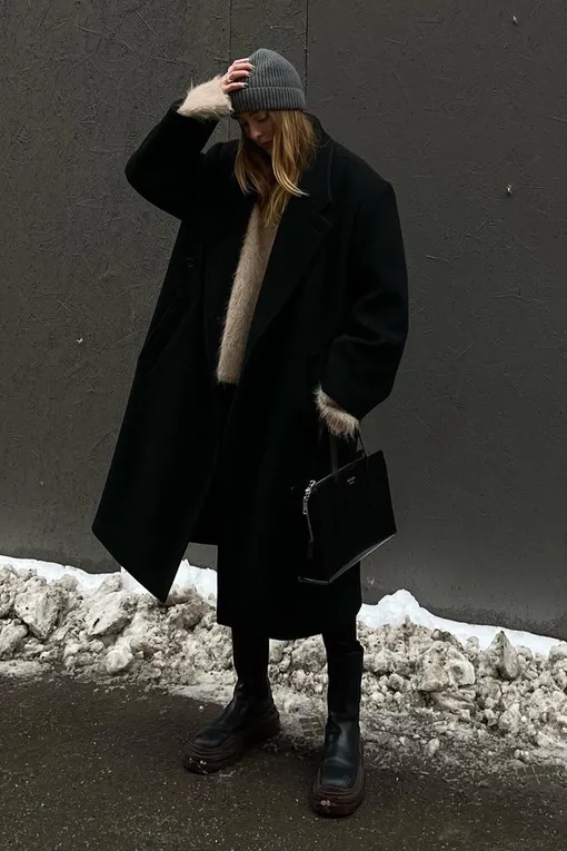 Еще одно классическое, но при этом совсем нескучное комбо. Берем объемный свитер с высоким горлом, юбку-миди прямого кроя (она может быть из трикотажа или плотной костюмной ткани) и пальто-оверсайз, которое будет хорошо сочетаться с объемным свитером и не будет стеснять движений. Последние штрихи — плотные колготки черного цвета и высокие ботинки на массивной подошве: со шнуровкой или резинкой.