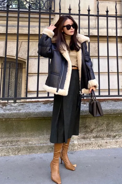 Дубленки-авиаторы — самая любимая верхняя одежда всех модниц, которая не покидает список главных трендов уже не первый сезон. Дубленка будет отлично смотреться с любой одеждой, но особенно — с юбкой-миди А-силуэта и тонкой, но теплой водолазкой (например, из кашемира или мериноса). Дополнить наряд можно ботфортами на шпильке или парой ботинок челси.