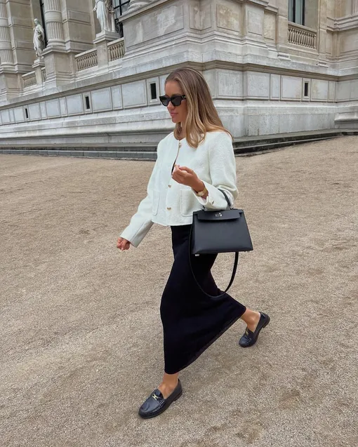 Простая юбка макси прямго кроя — лучшая инвестиция в гардероб. Она идет всем, вне зависимости от возраста и типа фигуры. Для создания максимально элегантного образа в лучших традициях стиля парижанок, сочетать такую юбку стоит с твидовым жакетом. Они могут быть одного цвета, либо контрастных оттенков — в обоих случаях смотреться комбо будет очень эффектно. Дополнить его можно балетками, лоферами или сапогами на устойчивом каблуке.