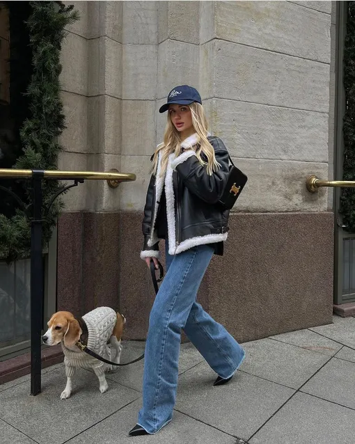 Чтобы создать образ, в котором будет комфортно провести весь день, сочетайте короткую дубленку с любимыми джинсами, шерстяной водолазкой и парой ботильонов на каблуке. Аутфит получится одновременно расслабленным и элегантным и подойдет для любого случая. Классным акцентом станет головной убор — бейсболка или меховая панама.