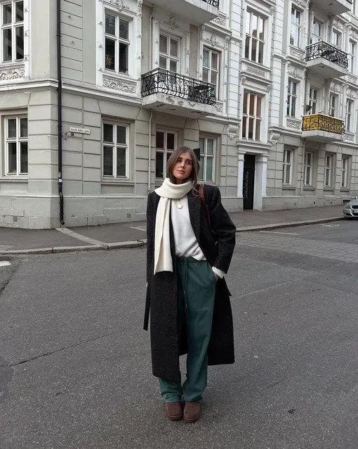 Сложно придумать более комфортное сочетание, чем пара уютных спортивных джоггеров и угги. Можно составить полностью спортивный образ и дополнить это комбо дутым пуховиком, однако куда эффектнее оно будет смотреться с широкоплечим шерстяным пальто: благодаря последнему наряд обретет элегантность. Не забудьте захватить любимую вместительную сумку и шапку.