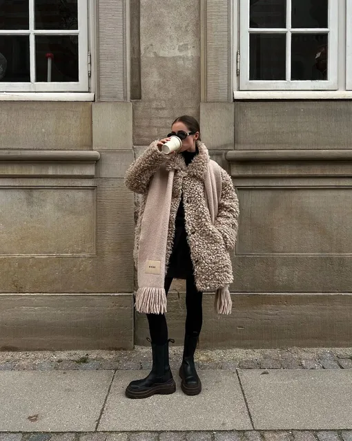 Самая очевидная обувь в пару к шубе — высокие сапоги, однако ботинки на прорезиненной подошвой станут ничуть не худшим выбором. Такой обуви не страшны любые слякоть и снег, а шуба не даст замерзнуть даже в самую холодную погоду. В это комбо отлично впишутся и джинсы, и широкие брюки из костюмной шерсти и даже леггинсы — сочетать его можно практически с любой одеждой.