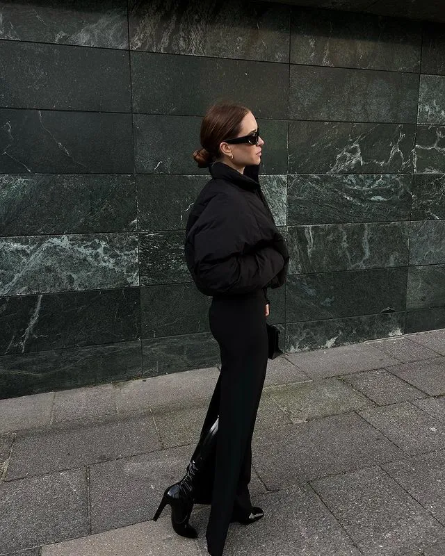 Пуховик и юбка - не самое очевидное, однако очень стильное сочетание. Короткая юбка едва ли подойдет к настолько теплой верхней одежде, а вот модели длины миди или макси - вполне. Для большей элегантности, создайте монохромный лук: пускай куртка и юбка будут одного цвета. Дополнить такое комбо можно грубыми ботинками или высокими сапогами на устойчивом каблуке.