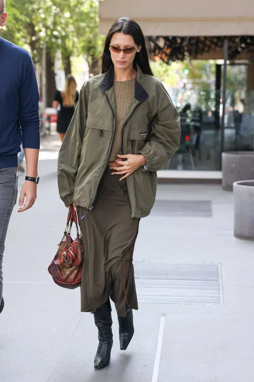 Куртки-ветровки давно перестали быть атрибутом исключительно спортивного гардероба. Носить их сейчас можно буквально с любой одеждой. Остановить свой выбор мы рекомендуем на базовой юбке миди - с курткой в спортивном стиле они образуют сбалансированный, гармоничный и очень универсальный образ. Дополнить его достаточно высокими сапогами и любимой сумкой.