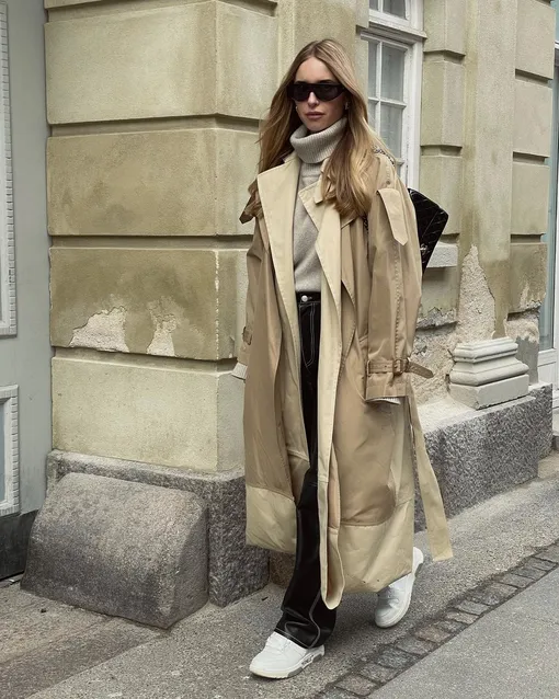 Шерстяное пальто отлично греет, однако в дождливую погоду его носить не рекомендуется: все же шерсть не самый влагостойкий материал. Достойным эквивалентом демисезонному пальто станет тренч в сочетании с очень теплым свитером с высоким горлом. Трикотаж возьмет на себя согревающую функцию, а плотная ткань тренча отлично защитит от дождя и ветра.