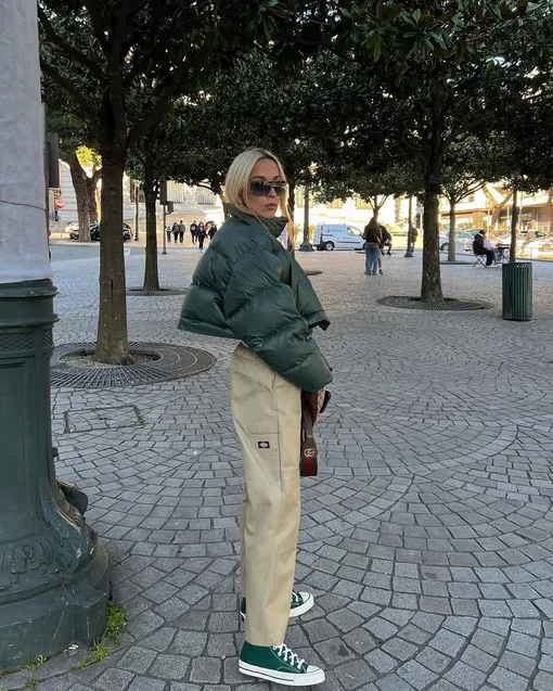 Для длинных дутых пуховиков пока все же жарковато, а вот стильные короткие модели в середине октября придутся в самый раз. Сочетайте куртку с любимым худи или тонким джемпером, а вниз наденьте брюки с высокой посадкой. Вместе с коротким верхом они здорово сработают на визуальное увеличение роста и вытягивание силуэта. Кроме того, сложно придумать более удобный наряд на каждый день.