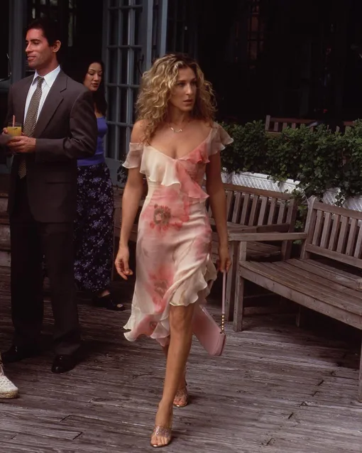 Один из самых романтичных образов Кэрри — легкое цветочное платье с оборками, которое она надела на свидание с Бигом. Несмотря на то что в сериале оно появилось всего на несколько минут, платье до сих пор считается культовым. Вы можете поискать похожую модель в магазинах или же сделать ставку на любую другую цветочную опцию. Например, на элегантную комбинацию или трогательное мини в стиле babydoll — такие сейчас актуальнее всего. А сочетать платье предлагаем с изящной обувью на каблуке: мюлями, как у Кэрри, трендовыми слингбэками или классическими лодочками. Не обойдется аутфит и без модной прически. Так, здорово подойдут популярные небрежные волны или так называемые «nirvana waves».