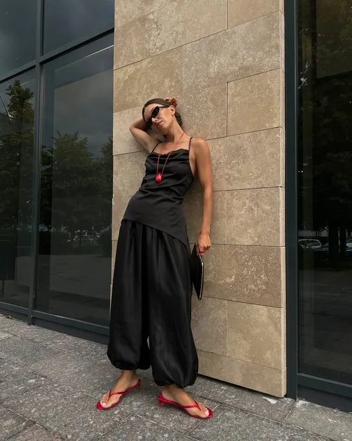 В том случае, если хочется увеличить градус трендовости в комплекте, на помощь придут брюки-алладины, которые уже стали самыми виральными штанами лета-2025. В пару к ним советуем подобрать удлиненный шелковый топ, который сидит идеально по фигуре и «регулирует» пропорции в этом расслабленном аутфите.