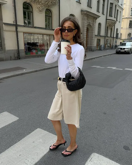 Если хочется выгулять вьетнамки на каблуке на работу, всегда можно вписать их в офисный дресс-код. Для этого понадобятся всего две вещи — легкий трикотажный лонгслив в белом цвете и актуальные шорты-бермуды, которые по праву стали лучшей альтернативой «корпоративным» брюкам в летнее время.