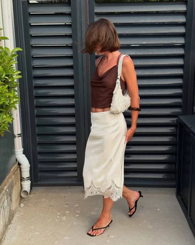 В том случае, если хочется увеличить градус трендовости в комплекте, на помощь придут брюки-алладины, которые уже стали самыми виральными штанами лета-2025. В пару к ним советуем подобрать удлиненный шелковый топ, который сидит идеально по фигуре и «регулирует» пропорции в этом расслабленном аутфите.
