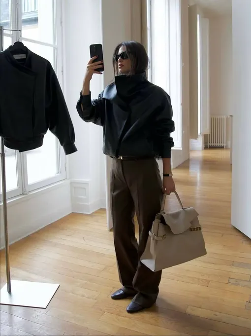 Если хочется составить черно-коричневый образ в пропорции 50 на 50, то рекомендуем поделить аутфит пополам и подобрать разные верх и низ. Например, грубую кожаную куртку с высоким горлом, которая выполнена в черном цвете, и утепленные шерстяные брюки со стрелками — в коричневом.