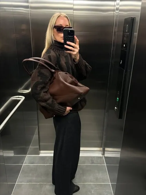 Не стоит забывать и о том, что характера образу могут придать аксессуары. Например, вместительная коричневая сумка, которая в этом году появилась у каждой уважающей себя модницы. Ею можно дополнить классический теплый лук в офис, который состоит из уютного свитера с высоким горлом и строгих прямых брюк-палаццо в черном цвете.