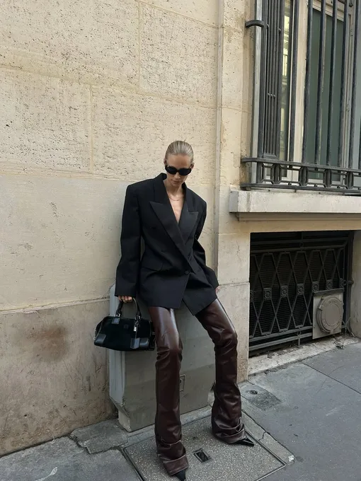 Еще один простой способ разнообразить темный повседневный лук — поиграть с фактурами. Например, подобрать к классическому черному пиджаку с массивными плечами актуальные кожаные брюки в коричневом цвете, которые будут контрастно сочетаться с верхом комплекта благодаря разным фактурам низа и верха.