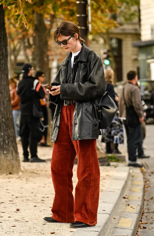 При покупке ориентируйтесь на силуэт. Самый понятный и функциональный вариант — прямого кроя. Свободные широкие модели добавляют расслабленности, клеш создает ретро-настроение, а брюки-сигареты красиво подчеркнут фигуру. Посадка может быть любой: высокая талия визуально вытянет ноги, а низкая добавит актуальности ансамблю. Цвет? Конечно, природные тона. И не только черный и коричневый, но и охристо-терракотовая гамма. И не списывайте со счетов светлые бежевые тона. А если хочется акцента, то присмотритесь к красному цвету.