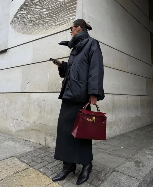 Мы часто недооцениваем согревающие способности длинных юбок. На деле же макси из костюмной шерсти в сочетании с плотными колготками и высокими сапогами зачастую способна согреть не хуже брюк. Верх к юбке можно подобрать любой, однако мы предлагаем сделать выбор в пользу облегающей кашемировой водолазки. Она отлично греет, но выглядит элегантнее объемного свитера. Останется только дополнить образ пуховиком, закрывающим бедра и удобной сумкой.