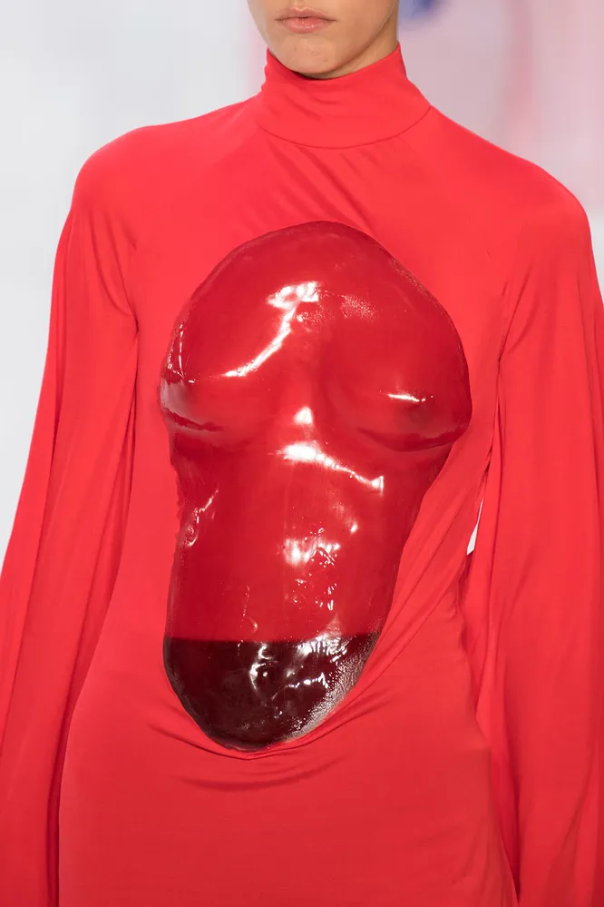Ну а Демна Гвасалия, Джонатан Андерсон и Оливье Рустен сосредоточенно изучают разные варианты выходов за границы физического тела. У креативного директора Balenciaga это выражается погружением в Средневековье, откуда дизайнер извлекает то девушек – темных рыцарей в комбинезонах, то принцесс в гротескного размера кринолинах, то святых мучениц в сияющих туниках. Андерсон в Loewe вспоминает о легендарной коллекции Comme des Garçons весна-лето 1997 года Body Meets Dress с ее деформирующими силуэт наростами и обыгрывает их на новый лад. А для пущей убедительности еще добавляет прозрачные «окошки», через которые просвечивают настоящие тела моделей. А дизайнер Balmain просто воспевает синеглазую Чани, которую сыграла Зендая в «Дюне» Дени Вильнева, с ее маскировочными драпировками цвета пустыни, защитными капюшонами и опасной чувственностью дикого зверя. Несколько увлекся косплеем и Николя Жескьер из Louis Vuitton, но обвинять его мы не станем: невесты Дракулы в асимметричных пышных юбках и «крылатых» двухслойных пальто выглядят так, будто им, заглянувшим в бездну, уже не страшны никакие испытания.