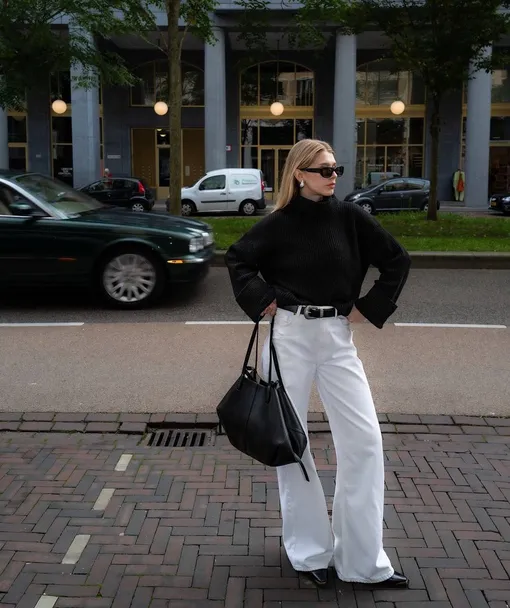 Многие считают, что белые джинсы не подходят для зимы, но это не так. Сочетание белых джинсов с черным свитером смотрится очень аристократично. Чтобы образ не получился бесформенным, заправьте свитер в джинсы и добавьте ремень для акцента на талии. Модные крупные серьги дополнят ваш лук.
