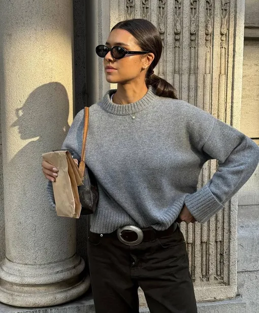 Серый свитер отлично смотрится с темно-коричневыми и черными джинсами. Темно-коричневый цвет — хит этого сезона, а черный — вечная классика. Рекомендуем сочетать свободный, но не мешковатый свитер с джинсами прямого или слегка зауженного кроя для создания расслабленного образа. Небольшие серьги, тонкая цепочка и ремень с крупной пряжкой дополнят лук.