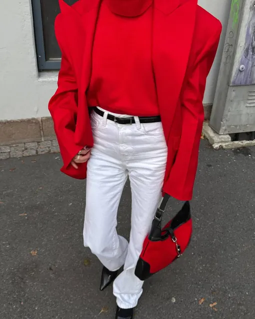 Красный трикотаж — один из самых трендовых в этом сезоне. Мы уже писали о «теории неожиданного красного» и о том, как этот цвет эффектно дополнит любой образ. Сочетая белые джинсы с красным свитером, подберите сумку в тон свитера, а обувь и ремень лучше выбрать черные, чтобы не перегрузить ваш аутфит. В качестве верхней одежды подойдет красное полупальто.
