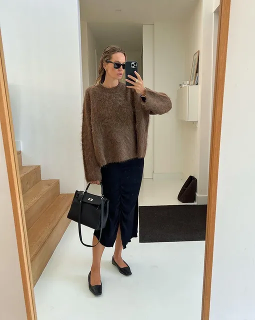 Комбо из свитера и классической юбки миди мы будем носить вплоть до наступления лета, меняя только обувь и верхнюю одежду. В сентябре без последней можно обойтись и вовсе, а в качестве обуви — выбрать пару балеток. К такому образу подойдут самые базовые модели — однотонные и без лишнего декора.