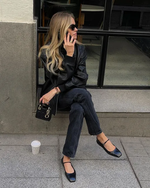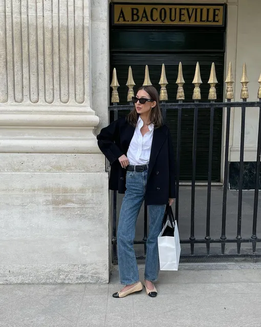 Сложно придумать более классическое сочетание, чем джинсы и пиджак: это удобно, красиво и уместно в любой ситуации. В целом, к этому комбо подойдет любая обувь: хоть кроссовки, хоть лодочки на шпильке. Однако, если хотите добавить образу больше парижского шика, беспроигрышным вариантом станут именно балетки.