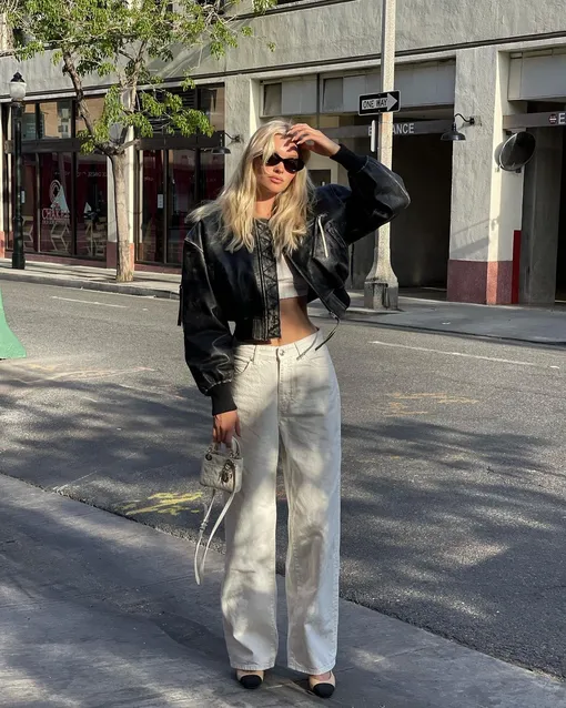Далеко не самое очевидное сочетание, которое, тем не менее, заслуживает называться одним из самых модных. Джинсы к балеткам лучше подбирать прямого кроя (эта модель также самая удачная для корректировки фигуры). Вниз под бомбер лучше надеть футболку или простой трикотажный топ, чтобы не перегружать образ деталями.