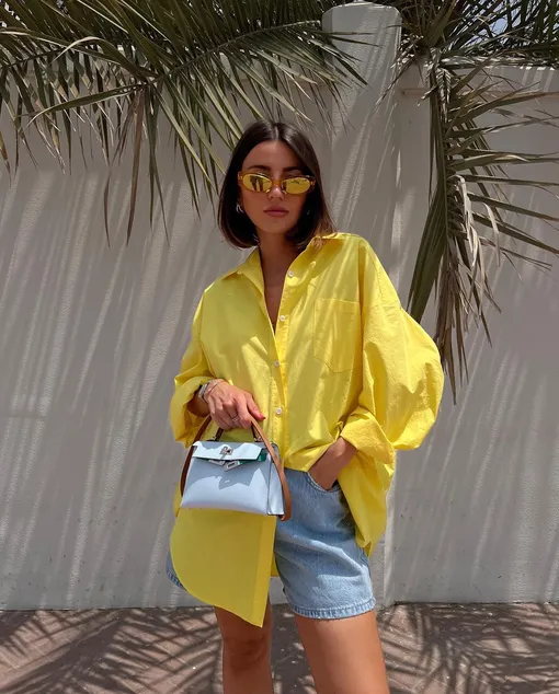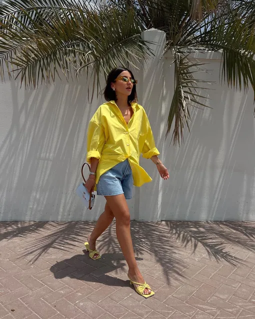 Комбо шорты + рубашка, куда более универсальное, чем может показаться на первый взгляд. Если вам весь день предстоит бегать по делам, сочетайте такой лук с классическими белыми кроссовками или удобными лоферами из мягкой кожи и вместительной сумкой-тоутом. Отправляясь на вечеринку, дополните шорты и рубашку мюлями на танкетке, яркой сумкой и заметными аксессуарами. Не стоит отказываться от ярких цветов, ведь они сейчас на пике популярности. Ищите желтые, голубые, фиолетовые, зеленые и розовые рубашки — все эти оттенки отлично сочетаются с денимом и помогут создать эффектный образ.