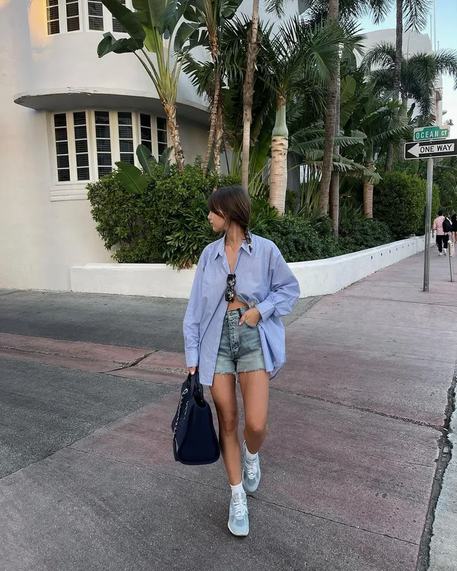 Комбо шорты + рубашка, куда более универсальное, чем может показаться на первый взгляд. Если вам весь день предстоит бегать по делам, сочетайте такой лук с классическими белыми кроссовками или удобными лоферами из мягкой кожи и вместительной сумкой-тоутом. Отправляясь на вечеринку, дополните шорты и рубашку мюлями на танкетке, яркой сумкой и заметными аксессуарами. Не стоит отказываться от ярких цветов, ведь они сейчас на пике популярности. Ищите желтые, голубые, фиолетовые, зеленые и розовые рубашки — все эти оттенки отлично сочетаются с денимом и помогут создать эффектный образ.