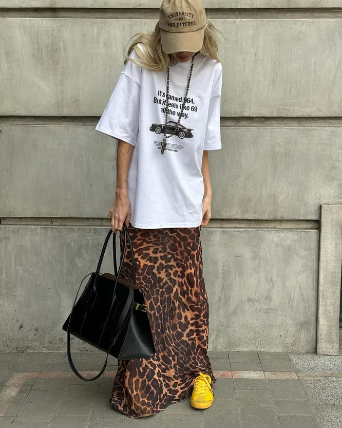 Футболку можете как носить на выпуск, так и заправлять в юбку - здорово смотрятся оба варианта. Дополнить комбо советуем акцентными аксессуарами. Например, если у вас юбка красного цвета, то попробуйте подобрать к ней кепку в тон. Такой стайлинг-трюк в TikTok прозвали «методом сандвича». А если вы остановились на базовой юбке и футболке, то здесь не обойтись без крупных украшений. Иначе образ рискует выглядеть слишком скучно. К примеру, советуем обратить внимание на трендовые баббл-украшения: такие моментально сделают аутфит интереснее. Что касается обуви, то она может быть любой. Для долгих прогулок выбирайте удобные кеды или балетки, в офис — лоферы или «мужские» дерби, а на свидание — изящные слингбэки или лодочки. А в качестве сумки отлично подойдет трендовая сейчас модель «такса» или элегантная сумка-браслет. Если будет прохладно, можете дополнить аутфит пиджаком прямого кроя или джинсовой курткой. Больше вариантов стилизации смотрите в галерее ниже.