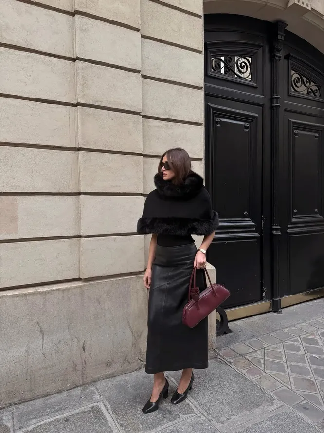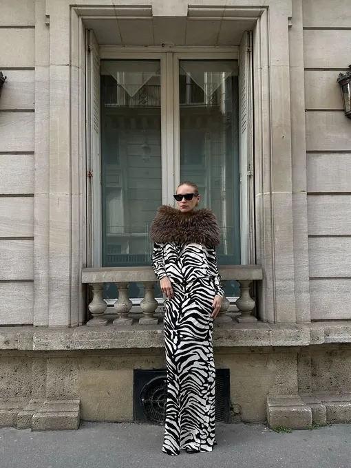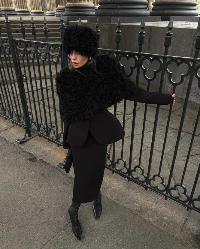 Пушистые фактуры создают движение, мягко обрамляют плечи и придают образу ту самую кинематографичность, которую невозможно подделать другими материалами. Плюс мех подчеркивает торжественность момента. Главные герои сезона — горжетка, боа и короткая накидка. Горжетка идеально сочетается с платьями, корсетами и акцентными топами, делая плечи визуально более хрупкими. Меховое боа, напротив, привносит театральность и игривость — с ним легко создать настроение великосветского выхода. Но соблюдайте баланс, чтобы не перейти в карикатурность. Короткая накидка — универсальный вариант для тех, кто любит классику. Ее выбирают, когда нужен ретро-эффект. С чем носить любую из этих опций? Стилизовать меховые аксессуары проще, чем кажется. Во-первых, экспериментируйте с разными фактурами. Мех классно сочетается с бархатом, кожей и шелком. Во-вторых, вы можете примерить такой элемент с любым «верхом»: платьем, блузой, рубашкой, боди и даже жакетом. И не бойтесь играть с цветовыми сочетаниями: сейчас актуален колор-блок и анималистичные принты.