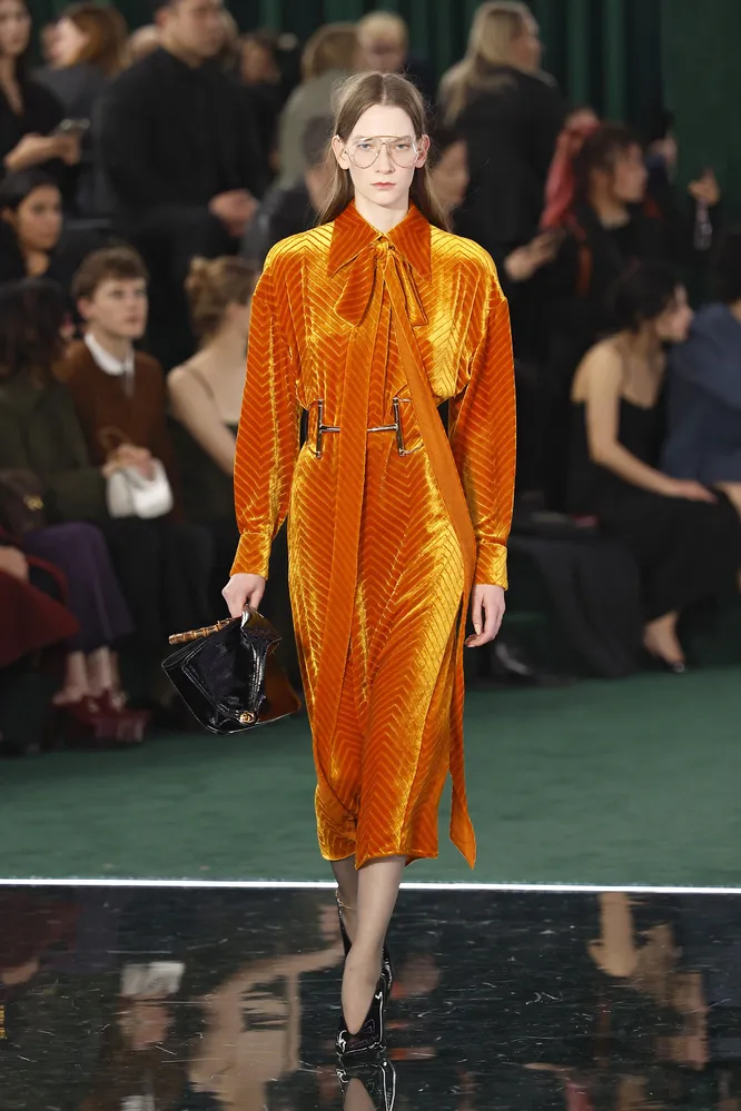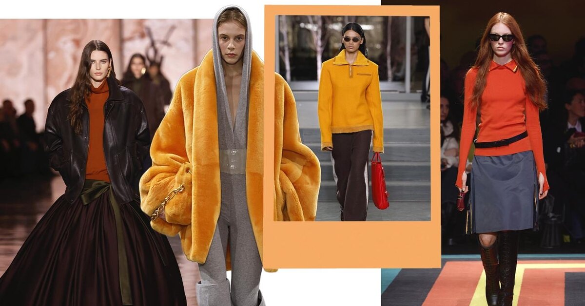 Если красный уже кажется вам слишком предсказуемым, дизайнеры предлагают переключиться на его более солнечного «родственника» — оранжевый. В коллекции Gucci этот оттенок проявился максимально смело в виде платья и юбки насыщенного оттенка апельсина. Saint Laurent выбрал «пряную тыкву». Например, кружевной дуэт блузы и юбки, а также водолазку. У Miu Miu оранжевый звучит мягче: мы подметили персиковые брюки, которые легко встроить в повседневный гардероб. Tory Burch предложили желто-оранжевый свитер на молнии, а K-way сделал ставку на красно-оранжевый джемпер-поло. Почему стоит выбирать оранжевый вместо красного? Красный — цвет страсти и силы. Но этот сезон настроен на другие эмоции. Оранжевый дарит тепло, уют и жизнерадостность, не теряя при этом своей выразительности. Он мягче алых тонов, но все еще достаточно яркий, чтобы стать центром образа. К тому же оранжевая гамма довольна универсальна.