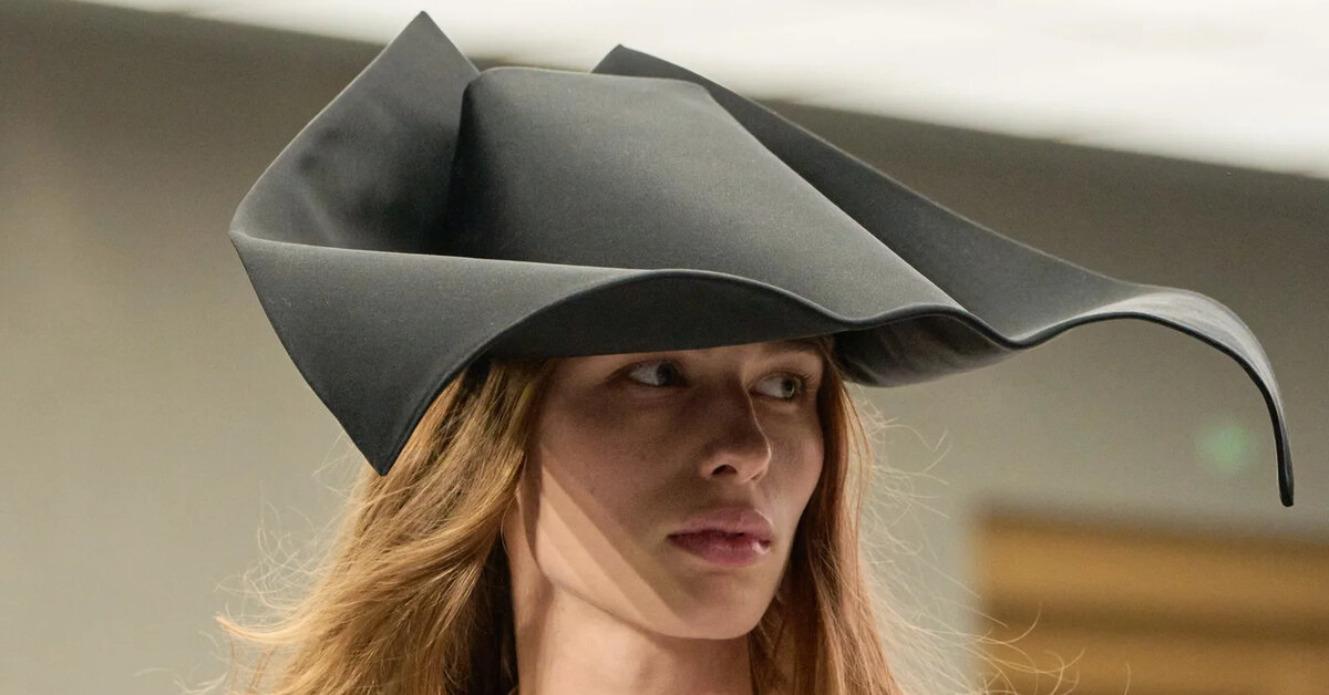 На показе Dior весна-лето 2026 Джонатан Андерсон превратил головные уборы в самостоятельный художественный язык. Стивен Джонс создал деформированные треуголки — переосмысленную версию шляп XVIII века, которые традиционно ассоциируются с эпохой Наполеона и придворной модой. В интерпретации Dior классический силуэт меняется: поля смещаются, линии нарушаются, создавая иллюзию движения. Смелая игра между историей и экспериментом.