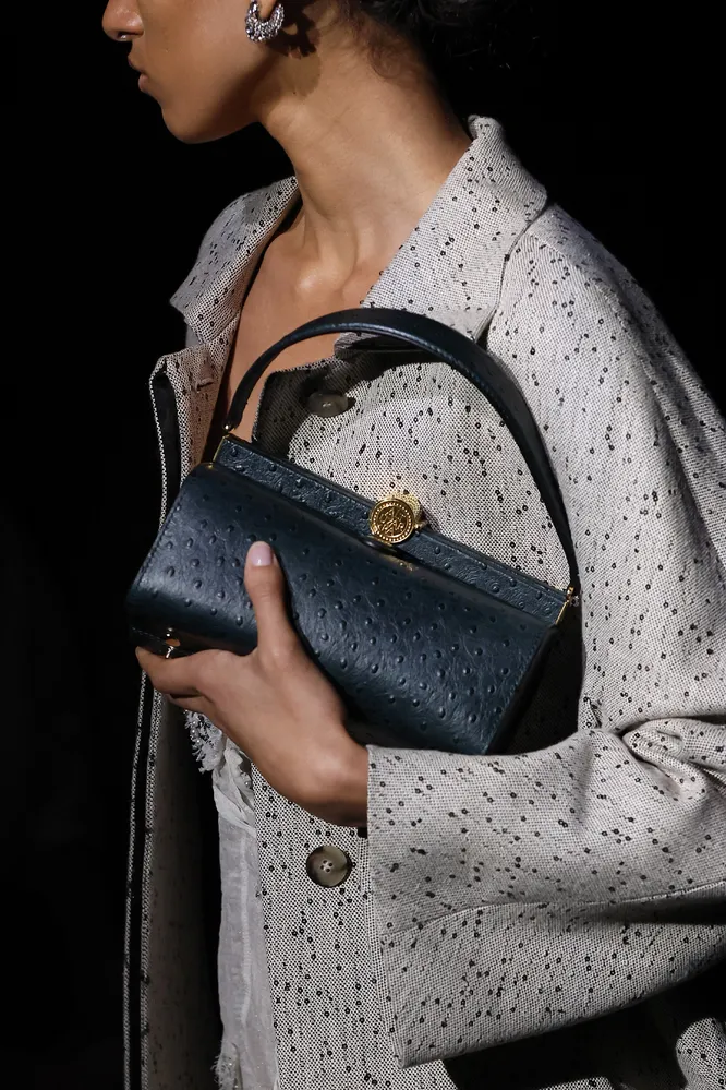 Итак, главный аксессуарный тренд сезона весна-лето 2024 — это сумки в ретро-стиле. Что их отличает? По форме и стилистике они отсылают к моделям ридикюлей, которые были в моде в 30-е, 40-е и 50-е. У них лаконичная форма, жесткий каркас, короткая ручка (или вообще ее отсутствие), а также спокойные цвета и минимум декоративных деталей. Обычно единственным декором на такой сумке выступает застежка, чаще всего — металлическая, в золотом или серебристом оттенке. Как правило, это либо металлический клапан, либо небольшой аккуратный замок. Молнии, впрочем, тоже никто не отменял — но они либо скрытые, либо, напротив, нарочито декорированные. На самом деле, тренд на ретро-ридикюли всколыхнул моду еще несколько лет назад. Сначала их сделала своей визитной карточкой Фиби Файло в Celine, а затем эстафету подхватил ее «ученик» Дэниел Ли, возглавив Bottega Veneta. Созданный им клатч-«пирожок» The Pouch, похожий на трогательные сумки, с которыми ходили наши бабушки и прабабушки, моментально завирусился в соцсетях и стал настоящим хитом. С тех пор только ленивый дизайнер не попытался представить какое-то свое прочтение этой ретро-стилистики. Из наиболее удачных попыток последнего времени — сумка Ferragamo Hug с декоративной золотой застежкой, которая уже полюбилась всем героиням стритстайла. Не хуже, впрочем, справился и Джозеф Альтузарра: на своем весенне-летнем показе он выдал моделям в руки каркасные сумки-шкатулки с короткими ручками. Коллег своими новинками также поддержали Виктория Бекхэм и креативный директор Etro Марко де Винченцо.